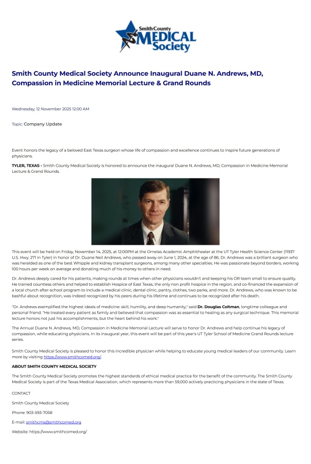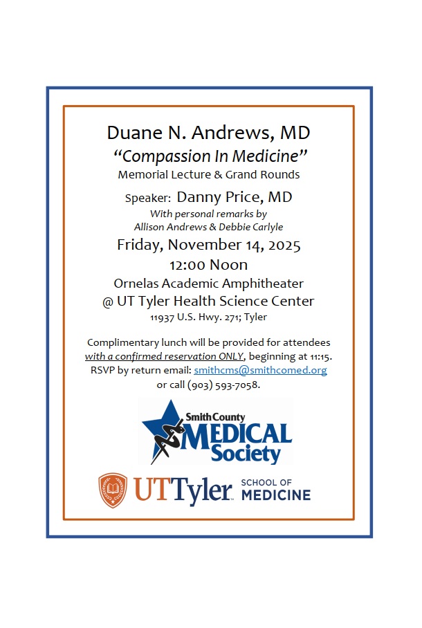 The Mission of the Smith County Medical Society is to promote and encourage the highest standards of ethical medical practice for the benefit of the community and to serve as an advocate for the physicians of the Smith County Medical Society in achieving this end.